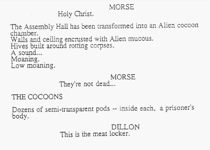 Dillon is the quintessential fiery proselytiser; a Malcolm X type (as you can see, he was even originally named Malcolm in early scripts) his voice is naturally stentorian and his language also heavily apocalyptic. Ine one draft he beats the prisoners for their attempted rape of Ripley and exclaims as he swings, “You will not fornicate! You will not rape! You will live up to your vow! You are too close to heaven to turn around!” In a later script the death of one prisoner makes him comment that “Deep shame fills my soul”; not far removed from the “frozen heart” and shamed melancholy of the Old English exile.