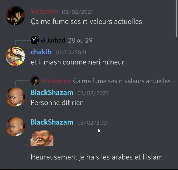 Rajoute à cela du trash talk sur absolument toutes les personnes de la et mêmes des personnes partiellement extérieures qui sont là depuis peu (cf : https://i.imgur.com/P6TagB6.png ) rajoutant qu’il ne pourra rien leur arriver car de toutes façons ils ont « le pilier » de la communauté de leur côté, maintenant ces mêmes personne m’accuse de racisme entre autres alors qu’ils sont suffisamment à l’aise pour dire ce genre de chose sous couvert apparemment de second degré :