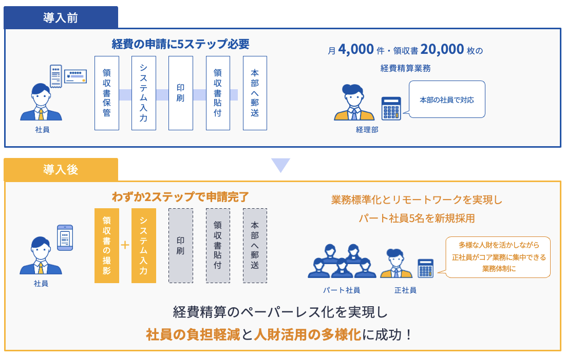 毎月約4,000件、領収書換算で20,000枚もの経費精算が発生。各拠点とは郵送で申請書をやりとりするなど、紙ベース特有のフローに悩まされていた