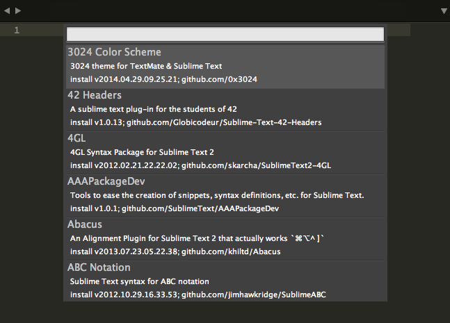 これで Package Control が使える状態になりました。新規パッケージをインストールするには、Command + Shift + P を押して Command Palette 画面を開き「Package Control:Install Package」を選択します。