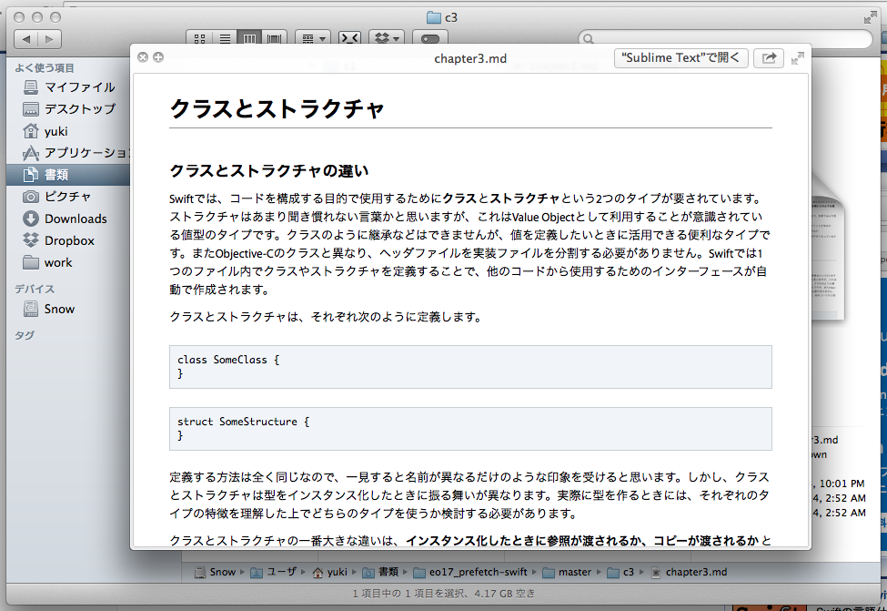 なお、競合で Markdown Quick Look Plugin for Mac OS X というのがありますが、コードがちゃんと整形されないので開発者には不向きだと思います。