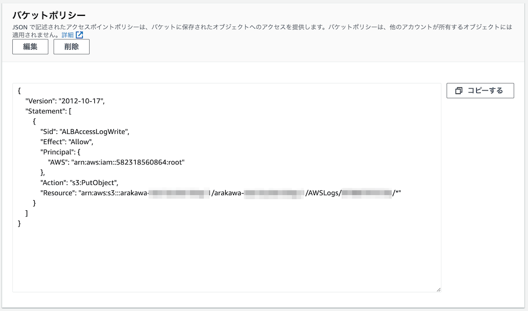 AWS 公式ドキュメントにしたがってバケットポリシーを作成しましょう。(ALB と同じバケットを使う場合は、ALB のバケットポリシーの Statement 箇所に追記してください。)