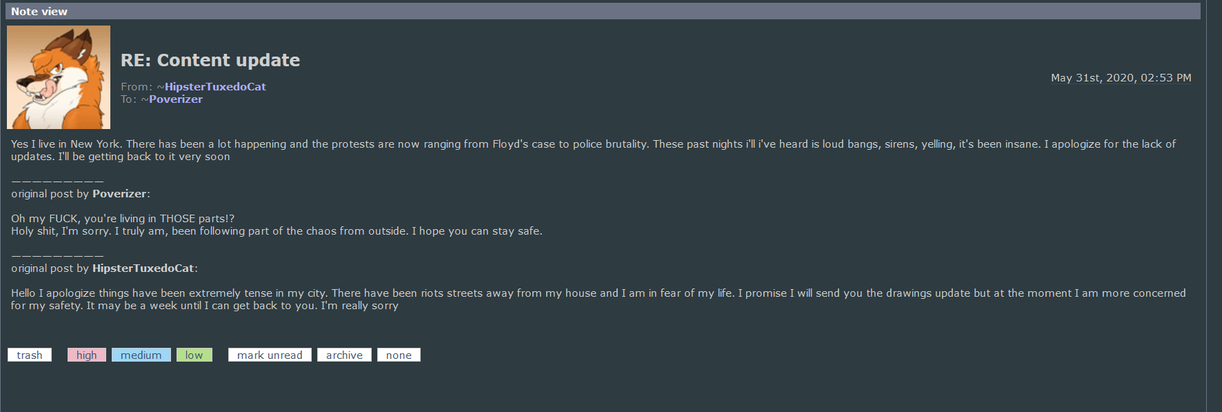 Later, I haven't received updates for a good month, so I asked about it. I was given a very lukewarm response, to which I replied with empathy and gave him time. Later, he closed down his note system, so I started to stay cautious. I left him a shout with no response. I then commented on his journal, to which he removed my comment and banned me. I have no way of reaching him, and struggling with Venmo my proxy is going to contact their banks to file a chargeback.