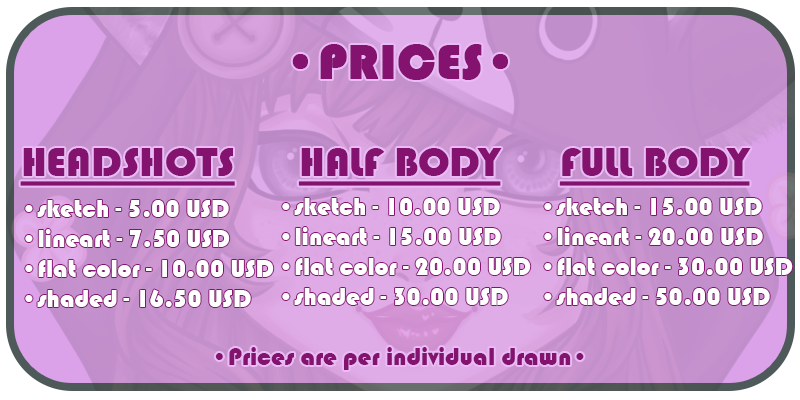 Prices will be paid fully up front due to scams. If your character has a high level of detail, it is likely I will discuss doing your commission at a higher price.