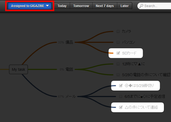 画面右上の「Assidned to…」から「GIGAZINE's tasks」選択。