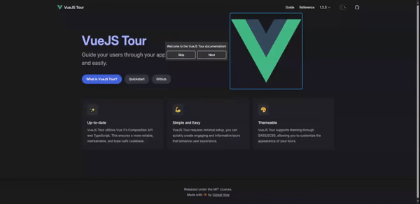 VueJS Tour is a lightweight, simple and customizable tour plugin. It provides a quick and easy way to guide your users through your application.