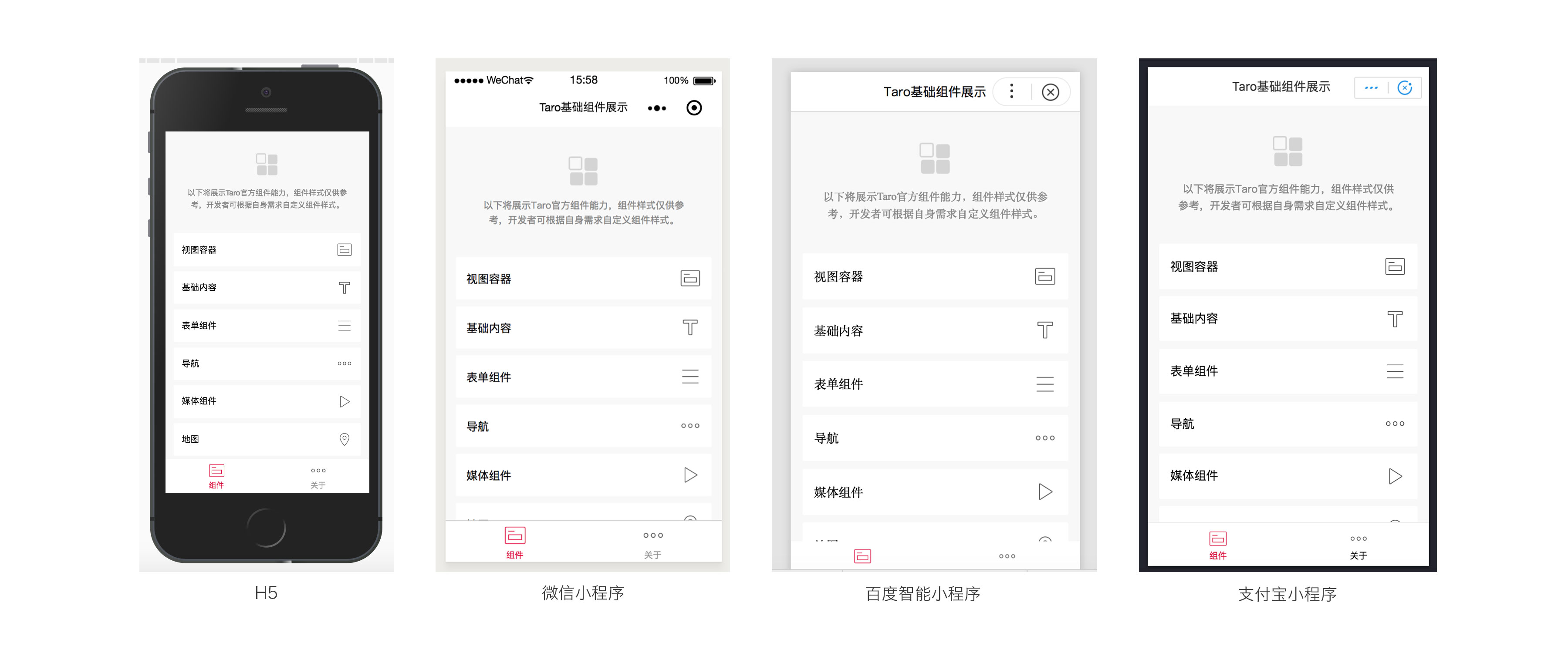Taro 方案的初心就是为了打造一个多端开发的解决方案。目前 Taro 代码可以支持转换到 微信/百度/支付宝小程序 、 H5 端 以及 移动端(React-Native)。