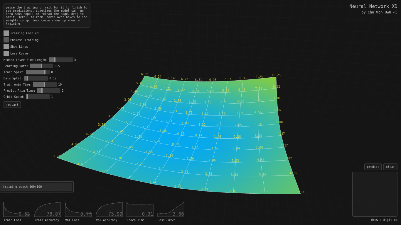 nn mnist digit recognizer neural network from scratch in pure js moment. demo xd: https://chuwon.github.io/nn/