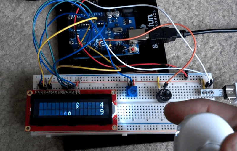 An Arduino board controls the 16×2 HD44780 character display. The game also includes sounds generated by the piezo buzzer seen on the breadboard. All the way to the right you can see the Wii Nunchuk breakout board which provides directional control and the firing trigger. If you want to recreate this one for yourself [Rjk79] is sharing the source code on Pastebin. There’s also a demo video found after the jump.