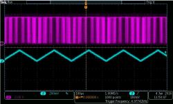 Once again looking at the modulator output we see the single bit representation of the original signal, and then the oscilloscope reconstructing the signal by averaging.