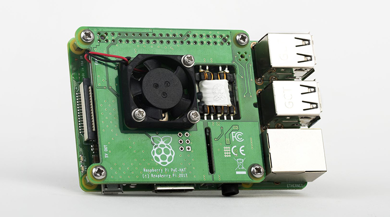 Raspberry Pi board fitted with a PoE HAT