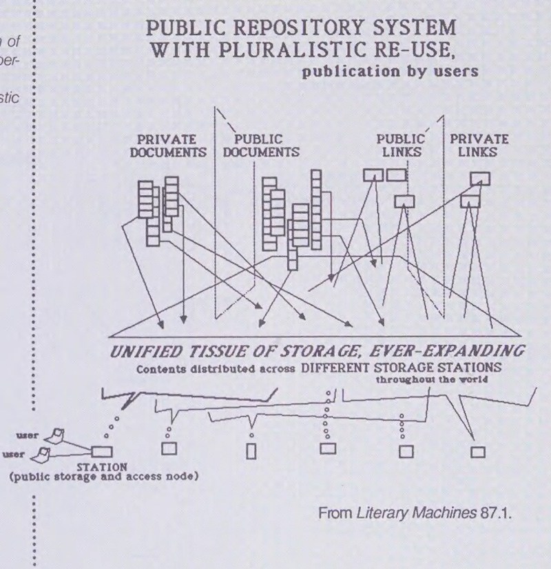You can say that what evolved into the Internet is decentralized, but when you look at how it is actually used, it really acts as a “unified tissue of storage, ever-expanding, Contents distributed across different storage stations throughout the world”, and we DO use it as a “public repository system with pluralistic re-use, publication by users”. So what we’ve got is more like Xanadu than different from it.