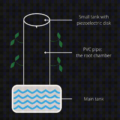 The ‘ultra’ part is a function of the way mist is created. In this case, it’s done with three piezoelectric disks mounted under a tank in the top of the PVC tube. Stick up to twelve plants in the little cubbies, and their roots will grow down the inside, where they’ll receive a fine shower of water at your command. Water that runs off the roots collects in a small tank at the bottom, where a pump starts the process over again.