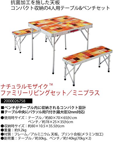 コールマンのリビングセットは、テーブルの天板部分に椅子(ベンチ)が収納されたセットになっており大変便利。モザイク柄で統一したデザインはどことなくオシャレですね。