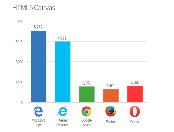 HTML5 CanvasではMicrosoft Edgeのスコアが一番高い結果となりました。また、Internet Explorer 11のスコアも高く、Google ChromeやFirefoxのスコアの4倍でした。Google Chrome、Firefox、Operaについては大差はありません。HTML5 CanvasのスコアはDOMの3〜10倍ほどとなっていることも見てとれます。
