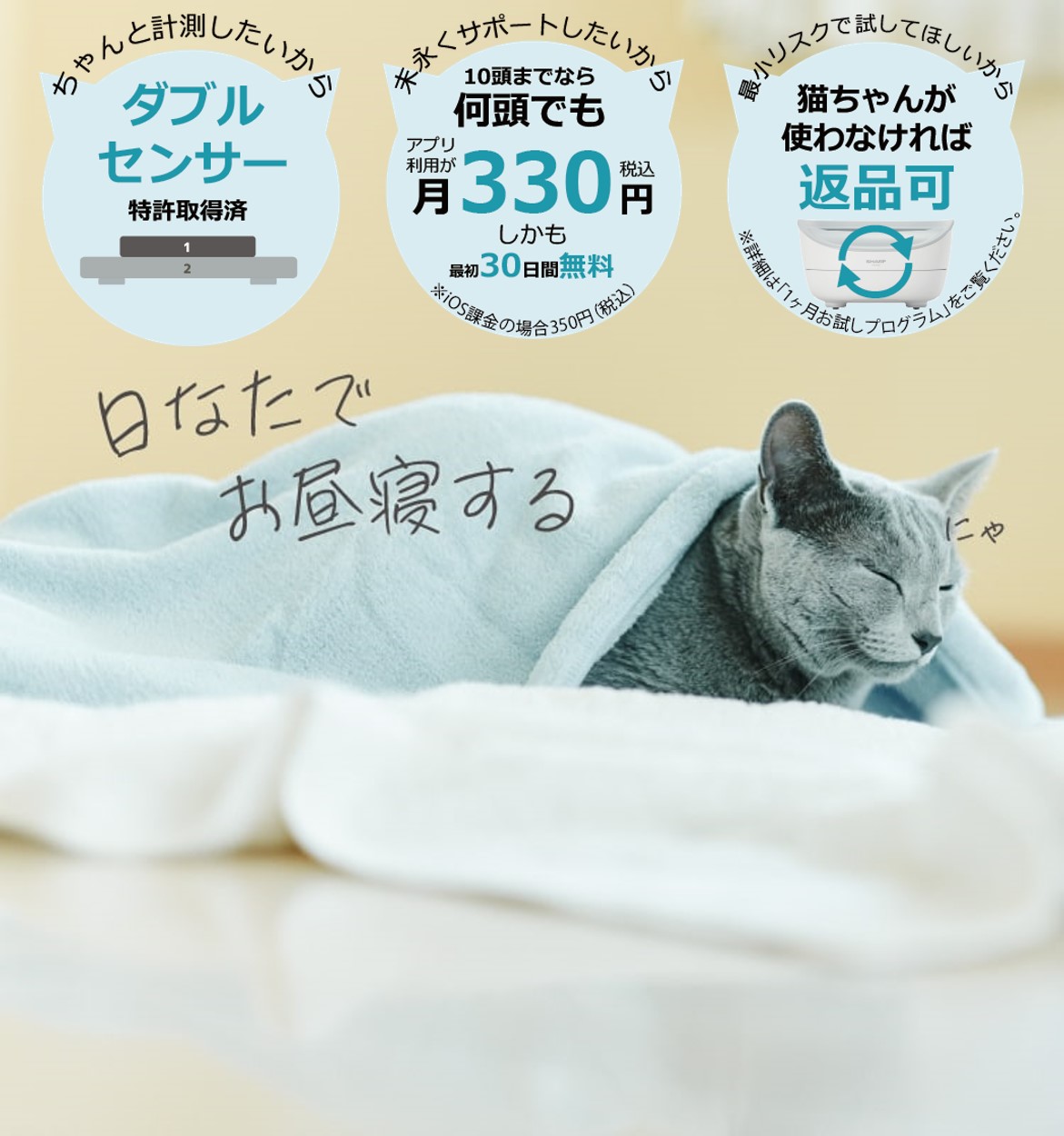 猫ちゃんの頭数※にかかわらず、アプリ利用料は月額330円(税込)です。