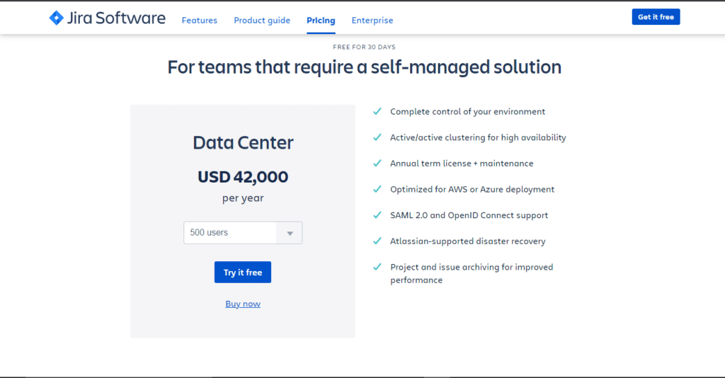 The “Data centre” solution provides you with complete control of your Jira environment. It is priced: at $42000/year for 500 users.