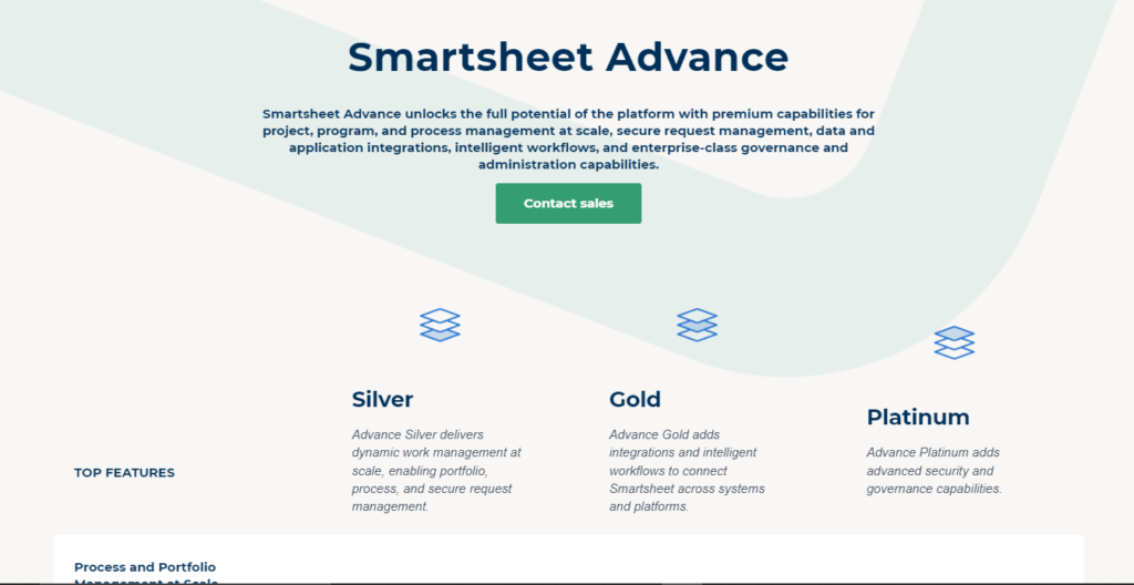 Additionally, you can opt for “Smartsheet advance” to get complete access to all features. It is further divided: into “Silver”, “Gold”, and “Platinum” plans. You can contact the sales team to get a price quotation.
