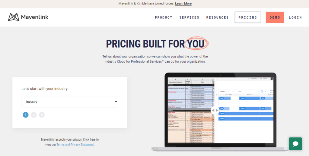 Mavenlink offers custom pricing options based on your business industry and tool requirements. To get a pricing quote, fill up your niche market, mention the size of your company and the location of headquarters. Once done, Mavenlink's sales team will reach out to you with the best-customized plan on the provided contact details.