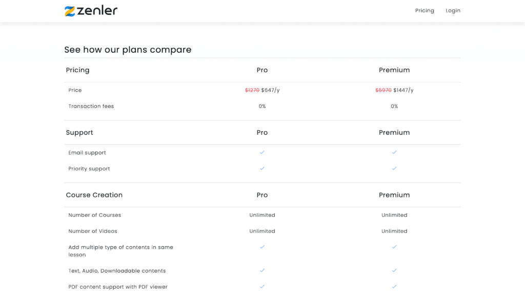 Both plans promise 0% transaction fees, emphasizing Zenler’s commitment to providing value and supporting the growth of online education businesses.