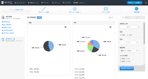 申込情報をもとに集計された統計情報が閲覧可能です。