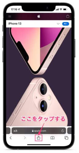 - Safariで検索してiPhone13のApple公式サイトを開き、画面下の↑マークをタップする