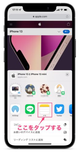 例として、iPhone13についてのApple公式ページのURLをメモに貼り付ける手順を説明します。ブラウザはChromeとSafariを使いますが、違いは最初のサイト画面で「共有」ボタンの位置が異なっていることだけです。