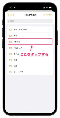 - フォルダ一覧から「iPhone」サブフォルダを選んでタップする。これで、メモは「メモ」フォルダから「iPhone」フォルダに移動した。