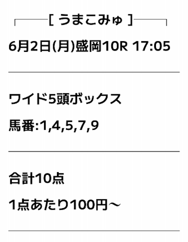 うまこみゅが公開したのはワイド5頭ボックス計10点の買い目。