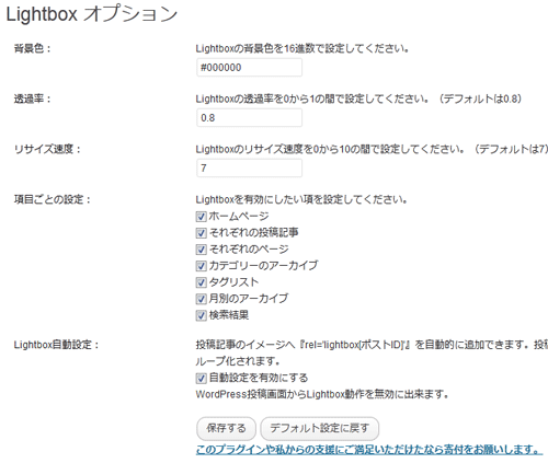 インストールが成功すると、WordPressの設定メニューにLightboxが追加されるのでそちらで以下の設定ができます。
