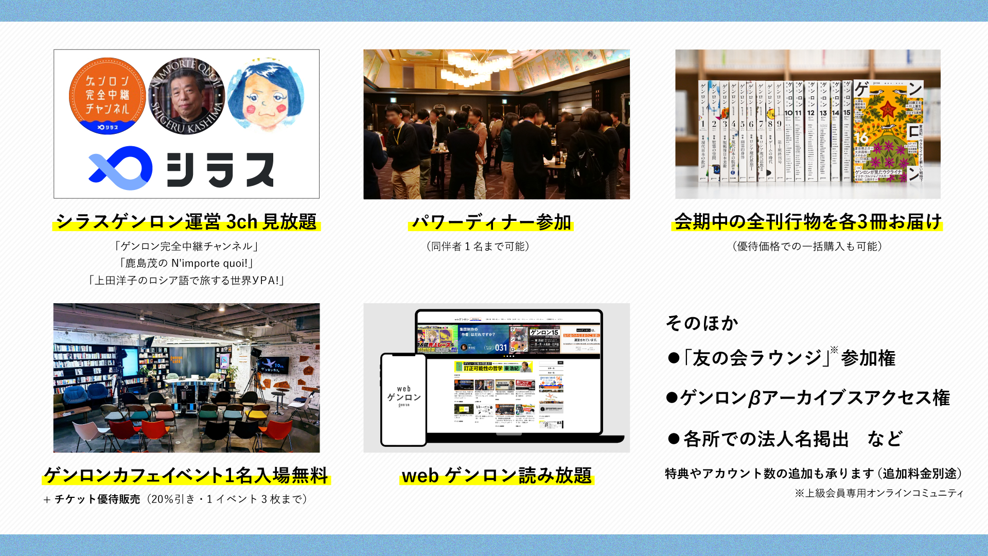 弊社運営チャンネルの無料視聴、カフェへの無料入場、パワーディナーへの同伴者付き参加、弊社発行書籍の割引など多数の特典をご用意しています。詳しくは表をご覧ください。増額していただくことで、新たな特典やアカウントの追加なども可能です。担当者をお付けしますので、気軽にご相談ください。