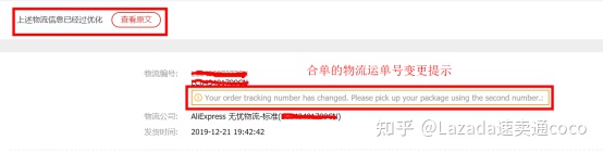 卖家可在订单详情中查看对应的物流订单是否有变更过,例如:如果是合单发货的订单,将会在交易订单详情中查看物流信息,会出现“Your order tracking number has changed. Please pick up your package using the second number.的提示。”