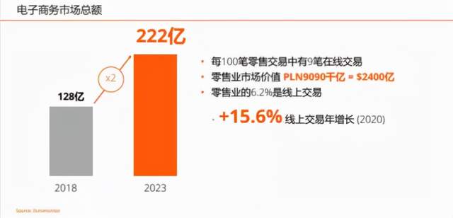 由于波兰经济的整体强劲表现,波兰的电子商务市场正在显示出惊人的增长速度,2018年商务市场总额达到128亿美元。在私人消费和强劲的消费者信心持续拉动下。预计到2023年,这个数字将翻番达到222亿美元。