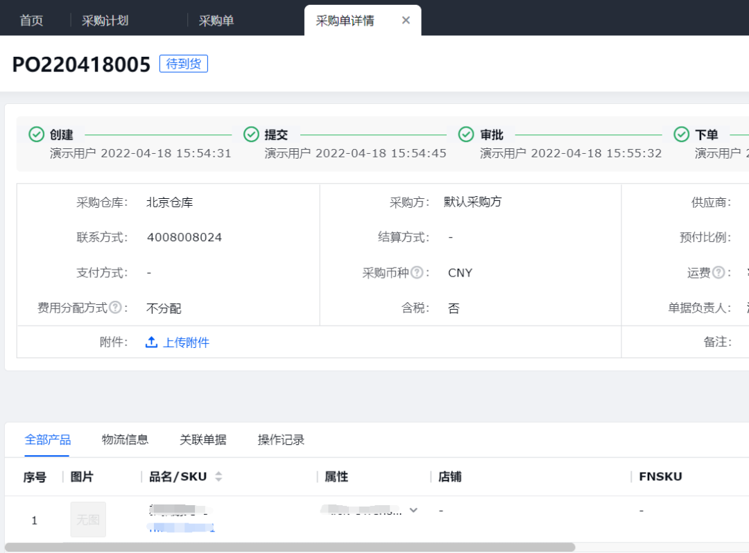 由运营人员线上创建采购计划后,领星ERP将自动为审批通过的采购计划合并成待审批的采购订单,便于快速跟踪采购到货情况。
