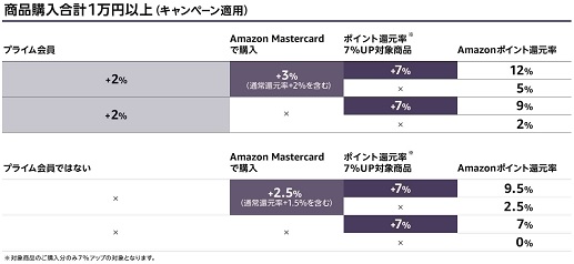 プライム会員なら還元率+2%、Amazon Mastercardに申込済みなら還元率+3%、対象商品の購入で+7%、最大12%の還元率になります。