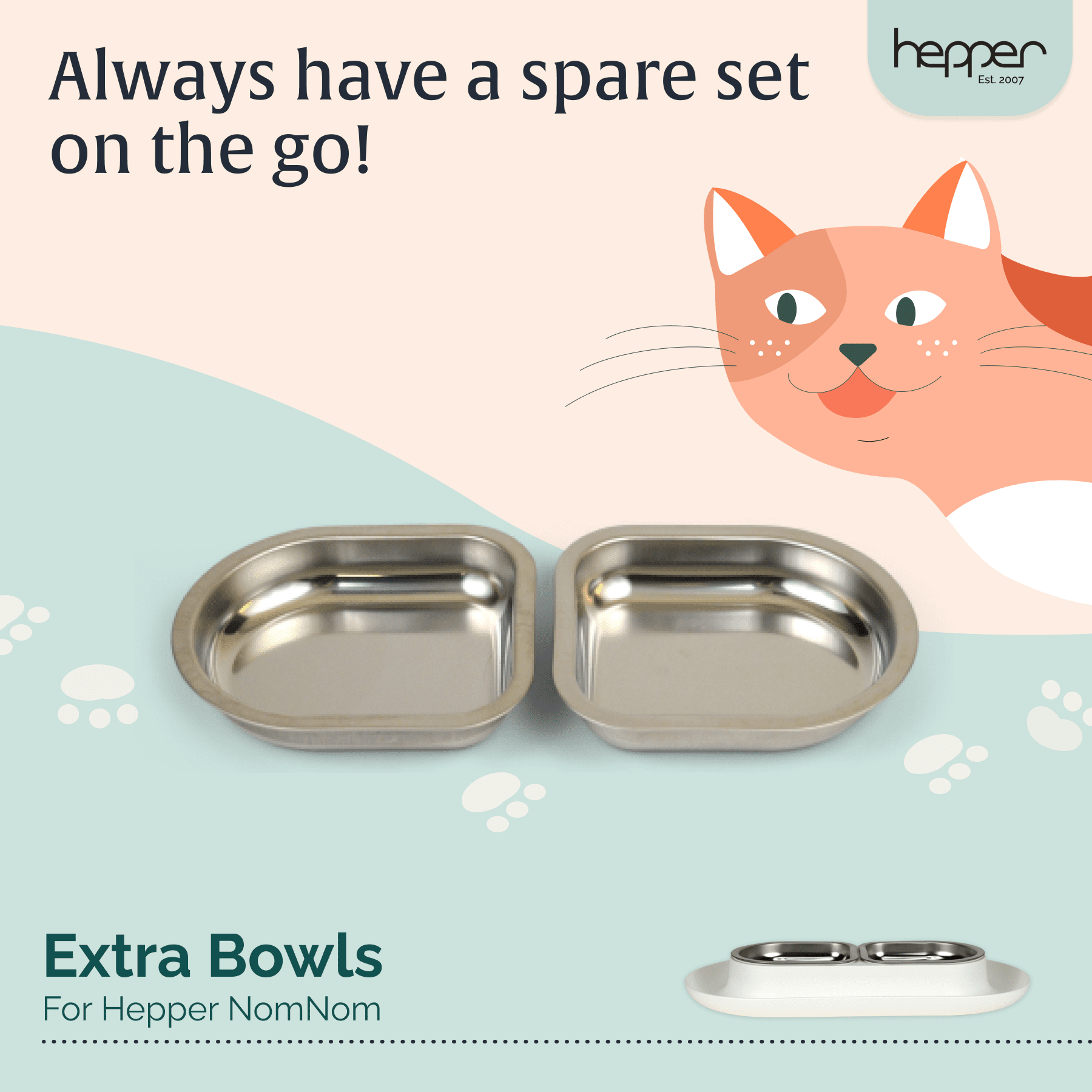 Set of two extra dishes to be used with your NomNom Food Bowl. Always have a clean set ready to go! The NomNom Cat Bowl helps your cat enjoy stress-free meals with our whisker-friendly design. The wide tray keeps your floor clean by catching drips and crumbs.