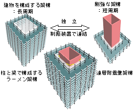 建物の中央に構築した剛強な心棒と、その外周に柱と梁による柔構造の建物を配置し、この2つの建物を制振装置(オイルダンパー)で連結させます。